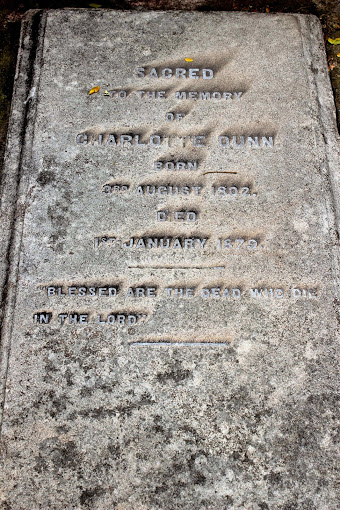Sacred to the Memory of Charlotte Dunn, Born 3rd August 1802, died 1st January 1879. Blessed are the dead who die in the Lord.