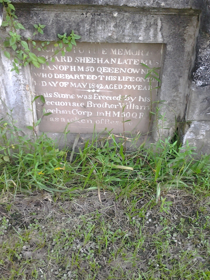 Sacred to the memory of Richard Sheehan Late Musician of HM 50th Queen’s Regiment who departed this life on the 16th Day of May 1842 aged 20 years. This tomb was erected by his affectionate brother William Sheehan Corp in HM 50 QR as a token of respect.