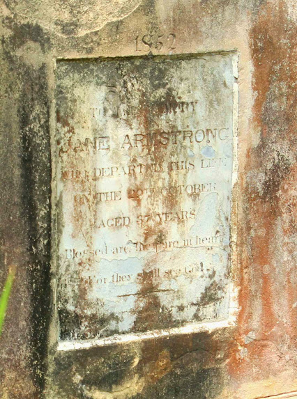 "[1852] Sacred To the memory of Jane Armstrong Who departed this life on the 29th October Aged 37 years Blessed are the pure in heart For they shall see God"