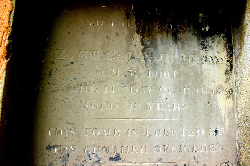 Sacred to the memory of Brevet Captain Brown, H.M. 31st Foot, obit 14th day of July 1846, aged 49 years. This tomb is erected by his brother-officers.