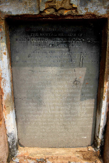 Gregorius Herklots came to India in 1789 and was appointed a member of the Dutch service in Chinsurah. Mainly famous as the fiscaal of Chinsurah, Herklots was also the interim governor from 1784 -5. After the British takeover, he continued in his position of fiscal under the new government. Herklots married a young widow, C.C. Herklots, and their marriage lasted 55 years. They had 16 children out of whom only 4 survived. At the time of death Herklots had thirty seven grand-children, thirty nine great grand-children and one great-great grand-child, in all a patriarchal family of 81 descendants. He became the Sudder Ameen of Hooghly in 1832 alongwith Radhagovind Soom. The highest office he attained in it was that of the magistrate. Herklots is mentioned in connection to the translation of the Dutch land deeds (pattas) into Bengali and in connection to ice-making in Chinsurah. In July 1817, he is recorded as receiving five hundred rupees for services as an accountant under the British governor Gordon Forbes. He also appeared as a witness in the trial of Pertaub Chand, the claimant to the throne of Burdwan. He is also mentioned in connection with the reprinting of the Malay Bible by the British and Foreign Bible Society. Herklots was the father of Mr G.A. Herklots who was the translator of the Qanun-i-Islam by Jaffer Shurrif (Shurreef, Jaffur, and William Crooke. Islam in India. Atlantic Publishers & Dist, 1999)