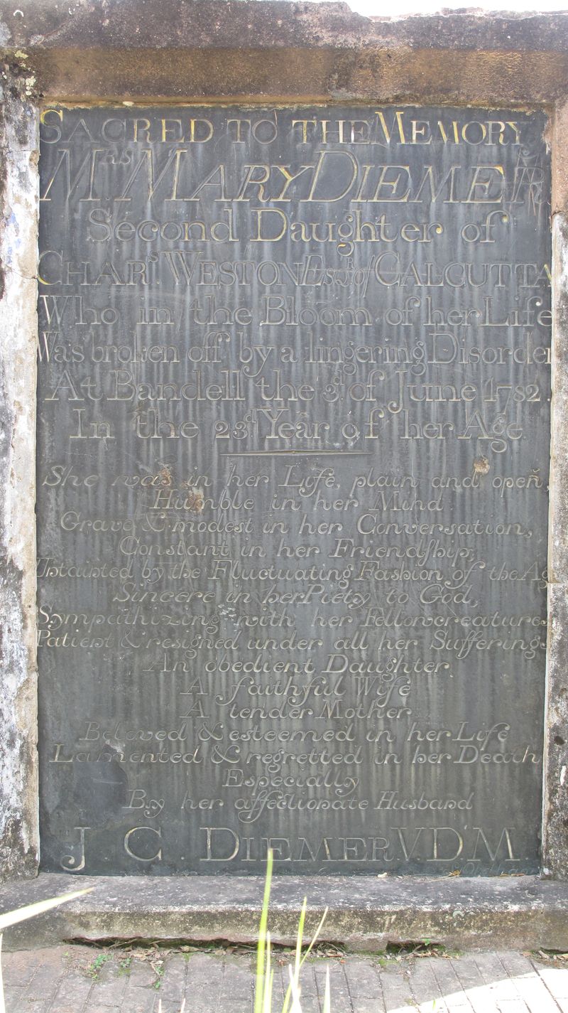 Her father Charles Weston (1731- 25.12.1809) was the son of a recorder of mayor's court at Calcutta, born in a house then opposite to where the Tiretta Bazar now stands. He was a friend of Holwell and a member of the Calcutta militia. His grave in the Park Street cemetery records that he died on the 25th December in the 78th year of his age. Weston features frequently in Archdeacon Hyde's writings as a generous and benevolent man as, it is relayed, that on the first day of each month he was wont to distribute alms to the amount of Rs. 1,600 "with his own venerable hand" to a crowd of unfortunates who flocked to Chinsurah to receive a share in this princely largess. Her husband John Christman Diemer (27.3.1745- 21.2.1792) was born in Gundershoffen, Alsatia to Johann Jacob Diemer. He attended high school in Buchsweiler. His schooling spanned from 10.29.1766 to 1770, and he studied theology and earned an admission to the "Protestant monastery" (College St. Guilleaume) in Strasbourg. On 17/11/1770 he matriculated at the University of Halle, to study theology. In 1771 Informator in the German boys' school and the Latin School; since November 1771 Table inspector to the German schools; Since October 1772 inspector of the German girls' school; In September 1773 ordination in the castle church Wernigerode; in 1774 travelled from London to Bombay and onward to Calcutta. Since 19.02.1775 he was a missionary in Calcutta. During 1779-1780 he stayed at the Cape of Good Hope. In 1783 he quits as missionary, in Calcutta. In 1785 returns to England, living in London. In 1786 and 1788 he makes trips to the Alsace and in 1789 returns to Calcutta to work with the 'Danisch-hallesche mission' (Written in 'sketches of missionary in north india' (1844).) He occasionally took over the charge of the school at Chinsurah and set up one himself for private pupils, in his own house, which was next door to the public school. 2 years after Mary dies (1789?), he returns to England with his only son. He marries Charlotte Catherine Goll on 5.3.1788 in Middlesex. He comes to India again as the company’s chaplain in 1791. Was in India during 1775-1792 (17 years). After arriving in India, would often minister in English, often also in German in Chinsurah. Also administered the sacraments. Died in Bengal and is buried at South park Street Cemetery, aged 44.