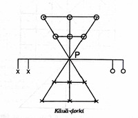 This game has been recorded by Charu Chandra Das Gupta in 1983 at Kosam village situated in the district of Allahabad. The informant of the game was Bacchu Singhala who was an inhabitant of the village. Das Gupta in his short essay further mentions about the similarities of Kaua Dorki and Egara-guti, or Lau-Kata-Kati or even Nao-Gutiya. The board as shown in the image has a common characteristic with the other games mentioned, which is that the two triangles meet each other at the apex. But one unique aspect of this game is that there is an additional horizontal line, intersecting the central point marked P, to which two vertical lines are drawn on each side and on where two pieces in possession of each player are placed at the beginning of the game. -