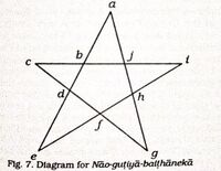 This game has been documented by Charu Chandra Das Gupta and the informant was a staff of the Nalanda Museum in Bihar. He explains it to be a kind of 'solitaire' as only one man plays it. He mentions the rules of the game as given below. He also finds similarity of this game with another game mentioned by another scholar, S.L Hora called Lam Turki which was played in Darjeeling, West Bengal. He mentions there are similarities but they are still played differently. He also mentions in his essay that Humphries, had described a similar game named Kowwa Daud played in the (United Province?) which also had similarities with Nao- Gutiya- Baithaneka. Apart from similarities what sets this aside from the rest as the name itself is Nao- Gutiya- Baithaneka or placing of the nine pieces but further movement of the pieces remain unclear. -