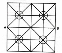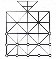 This game was documented by Hem Chandra Das Gupta and the informant was from Orissa. He explains this game as a simpler version of Tiger Play, or a variant of Tiger and Goats where two players play this game, one representing the tiger and one representing the goats. It is played with one piece of tiger and twelve goats. The goats are all first placed at cross-points and then the usual game follows of Bagh Chal. Although the rule of how many goats are to be captured by the tiger before being trapped and out of moves is not mentioned in the essay. He also states that this variant of Bagh Chal is similar and also a variant of another game called Kulaochal played by the Ho community in Kolhan and he draws this similarity from D.N Majumdar in his work on the games of Ho in Kolhan. He also mentions that although the similarities there are differences present in the two variants. He also compares this game with the game of Rimoe or Rimau in Indonesia. One major similarity between the two lies in the fact that before the beginning of the game, the player representing the goats is supposed to place all their pieces at cross-points. It is also noteworthy that the structure of this board is similar to that of Mughal Pathan or other alquerque boards of Bagh Chal. -