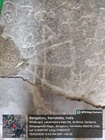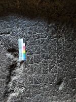 This incised or etched Bagh Chal board has been documented from Basavanagudi Bull temple in Bangalore, from one of the temple porches. Bagh Chal or Tigers and Goats is an ancient hunt game that has been popular in many regions of the world. The board of Bagh Chal is part of the alquerque family which traces its history to the Moors of Spain in their Libro de Los juegos (book of games) commissioned by Alfonso X in the 13th century. Although the rules were first found there, the history of alquerque goes further back to Egypt and to a name mentioned in the Kitab-al-Aghani (book of songs) as Kirkat or Al-Kirkat. Besides reference in literature similar game boards have been found both in practice amongst players in various communities as well as in archaeological sites. Bagh Chal has many variants, and is known by different names all over India, Nepal, Bhutan and other countries of South Asia. The structure of the board, the number of pieces and the variants in the rules may vary from place to place but the intention of winning remains the same. It is a two-player game where one individual represents the tiger and the other represents the goats. The number of tigers vary from one to even five in some games while the number of goats can be twenty or less or more depending on the structure of the board and the rules popular to the region. The Basavanagudi Bull temple is a popular pilgrim location and is famous for largest stone carving of Nandi, the vahana (vehicle) of Lord Shiva. This temple was built by Kempe Gowda who was also known as the founder of Bangalore. The temple also has a lot of local folklore about villagers worshipping the bull. Hence from the time of its origin to present day, it is frequented by tourists, pilgrims and local people of the region. This graffiti board lies on the right side of the porch. The temple is built in Vijaynagara style with the Nandi idol in the centre and porches on both sides. -