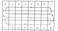 This game was documented at the region of Uttarkhand, which was once known as the British Garhwal by Hem Chandra Das Gupta during his geological fieldwork. The informants were inhabitants of the area. The game of bheri-bakri (sheep and goat) is a two person game played with 16 pieces equally divided between the players and 4 pieces of cowries as the dice. The 16 pieces represent the sheep and the goats white being the goats and the sheep is black. By means of the vertical and the horizontal lines the rectangular-diagram used for the play is divided into 24 compartments and of them 8 belong to each player as shown in the image. While the board looks similar to Tablan or Tabul Phale and the use of 4 cowries as dice might be similar, but there are other differences in the way both games are played. -