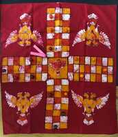 The first description of this game seems to have been written in the 16th century, when chaupar was a common gambling sport at the court of the Mughal emperor Akbar in Agra and Fatehpur Sikri. Abul Fazl describes how the game is played with sixteen pieces, three dice, and a “board” in the shape of a cross. The history of chaupar is linked to that of pachisi, not least because the boards are identical and that it is therefore impossible to see which of the two games an archaeological example belonged to. Also known as chausar or chaupad, this game has many similarities to the more well-known pachisi. A cross-shaped board hosts the pieces of four players, who play in two partnerships, each player having four pieces. The pieces begin at fixed positions around the board, racing around the board to finish at the centre. The game has also attracted much attention in the West and in colonial India. Thomas Hyde wrote about the game in his De Ludibus Orientalibus in 1694 followed by many other commentators and an 1851 painting of men playing chaupar by William Carpenter. Edward Falkener also published a detailed account of Pachisi in his Games Ancient and Oriental and How to Play Them in London in 1892 . There are multiple versions of chaupar and the rules and material vary. The Rajputs traditionally play the game during the entire night of a wedding, along with chanting, drinking tea and other beverages as well as smoking or chewing tobacco products. The Sodha Meghwals and the Rabaris faithfully follow the tradition of the Rajputs and play the game during marriage or any such festive occasion. The Rabari play the game on a board with seven khana (rooms) on each row, while the board of the Meghwal and the Rajput possesses eight squares on each row. The game is played with six cowries locally known as khairiya by the Rabari and with seven cowries both by the Rajput and the migrant Marvada group of the Meghwal of Sumrasar. It is also played by the Patwal families in Haryana and as Dosh Pochish among Sylheti communities. This Chaupar board is made of Batik print cotton cloth by Ramsons Kreera Pratisthan. They are working towards the revival of traditional Indian Boardgames. It also depicts the symbol of the Mysore royal family. Ramsons manufactures hand-made gameboards, casting pieces and counters. They collaborate with artists and artisans all across India to make these boardgames and their material have a number of varieties such as, Navalgund Jamkhana, Silk embroidery, Batik print, Mysore silk zari weaving etc. Other than variiants in types of cloth and handloom they also manufacture boardgames on Marble, Mysore wood, Brass Casting, Wood Polychrome and many as such. -
