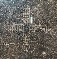 This is a documented image which showcases a small etched or incised Chaupar board on the floor along with another board of Mancala, almost overlapping. Speculation could suggest that they were either made one after another or in different times. This particular Chaupar board is relatively smaller than the other boards recorded in the cave temple of Pataleshwar. This could draw speculations that this board was made in an attempt to document what boards they played in the past or this could have been part of their trial and error process of etching boardgames on the ground without precise measurements. Pataleshwar cave complex are a small group of five excavations, developed into a cave temple dedicated to Pataleshwar, God of the underworld or Shiva. This cave complex is ruggedly excavated and also bears resemblance with the Elephanta caves of Mumbai. The cave has unfinished murals on the sides and on the backside. There is a Nandi pavilion at the entrance of the cave which is circular. The inside of the main cave contains a pillared hall with a pradakshinapatha the way to go around the shrine. One side of the cave remains unfinished. This and other boardgames were documented on the floor of the cave. According to anthropologists K. Ravi and Jaya Sankar Rao and the classification of HJR Murray in his book, The History of Boardgames Other Than Chess, Chaupar is categorised as a Race Game. The first description of this game seems to have been written in the 16th century, when chaupar was a common gambling sport at the court of the Mughal emperor Akbar in Agra and Fatehpur Sikri. Abul Fazl describes how the game is played with sixteen pieces, three dice, and a “board” in the shape of a cross. It is typically a four-player game and the pieces belonging to each player is distinct from the others. It is played with four pieces and a throwing of either cowrie shells or two oblong dice. There are various terminologies used for the safe squares, or the throws which differs from one region to the other. For example, in Haryana the central home which is a flower here is called 'charon ka ghar'. Interestingly, it can be played by a throw of six cowrie shells or even more depending on the variant. As this etched board is from Maharashtra, it is difficult to understand the exact throw of dice or cowries used or the rules made to play this game. -