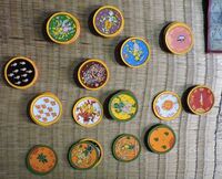 The Dashavatar Ganjifa cards of Raghurajpur Orissa are playing cards featuring the 10 avatars of Vishnu namely Matsya, Kurma, Varaha, Narasimha, Vamana, Parashuram, Rama, Balaram, Jagannath and Kalki. The total set contains 120 cards which includes 10 suits. Each suit contains one Raja or the king card, one Mantri or the vizier and ten number cards.