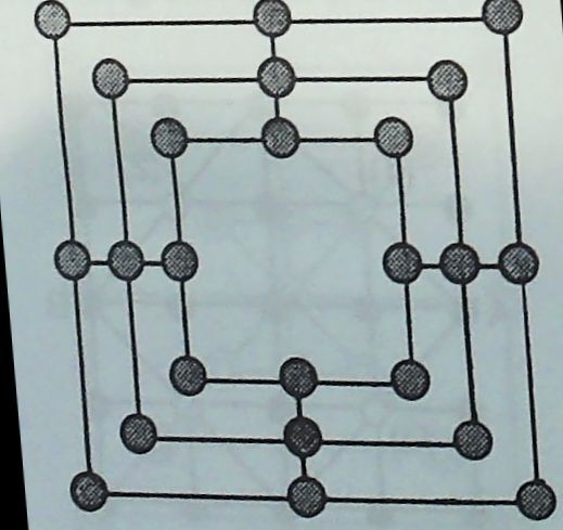 - Three concentric squares with lines connecting their midpoints. Nine pieces per player. Players alternate turns placing pieces on the board or moving one piece on the board to an adjacent empty spot. The first player to get three of their pieces in a row wins.
