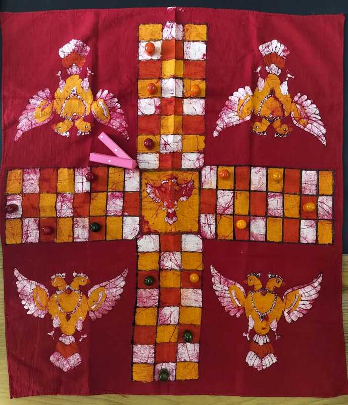 This Chaupar board is made of Batik print cotton cloth by Ramsons Kreera Pratisthan. They are working towards the revival of traditional Indian Boardgames. It also depicts the symbol of the Mysore royal family.