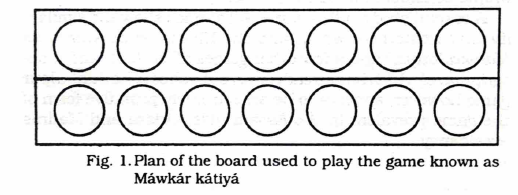 Two persons are necessary for the play and, to start with, five small stones are kept within each of seven holes. One of the players picks up the stones from a hole lying in the row just next to him and goes on putting one piece of stone into each depression. As soon as he has done with the five pieces he started with, he picks up all the stones lying immediately in front of the depression where the last piece was deposited. He must repeat this action till, after having deposited all the pieces that he may carry in his hand, he comes to an empty hole lying immediately in front of the one where the last piece was dropped. In this case all the pieces of stone lying within the hole immediately next to the vacant one will come into his possession and the other player will begin the game, following exactly the same method, each playing from right to left along his line of depressions and from left to right along the line of holes belonging to his adversary. The players will thus keep on the game alternately till all the pieces have been removed from the plank, with the general result that one of the players is in possession of more than 35 pieces of stone and the other less. The game will now be started for the second time but not by the player who started it on the previous occasion and one peculiarity will be observed while arranging the pieces. Suppose for example, that after the end of the first game, one player finds that he has 37 pieces in his possession then he will arrange 35 pieces in the usual way, while two (i.e. the pieces he has obtained in excess of 35) will not be placed in any of the depressions, but will remain to his credit while the game is being played for the second time. The other player will now arrange the 33 pieces. placing 3. within the depression lying to the extreme left along his line while the other six will contain 5 pieces each. On this occasion the following additional rules will also be observed : ©