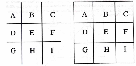 To start the game, each player has three distinctive pieces, such as cowries (shells) and tamarind seeds, or distinctive marks, such as x and O ( in case of Katakuti), are chosen to play the game. The player, who begins, places one of his pieces or mark on any of the areas marked A,B,C, etc. and then the other player occupies any other area. Playing thus alternately, all the six pieces are brought on the board. When all the six pieces are brought on the board, then the pieces are moved to adjacent vacant places but there is no jumping over or catching the pieces of the adversary. Effort is made to get one's three pieces in a straight line, i.e. ABC, ADG, AEI, and so on. One, who achieves this first, is the winner of the game, but it often happens that no one gets his three pieces in a straight line within a specified time and then the game ends in a draw.