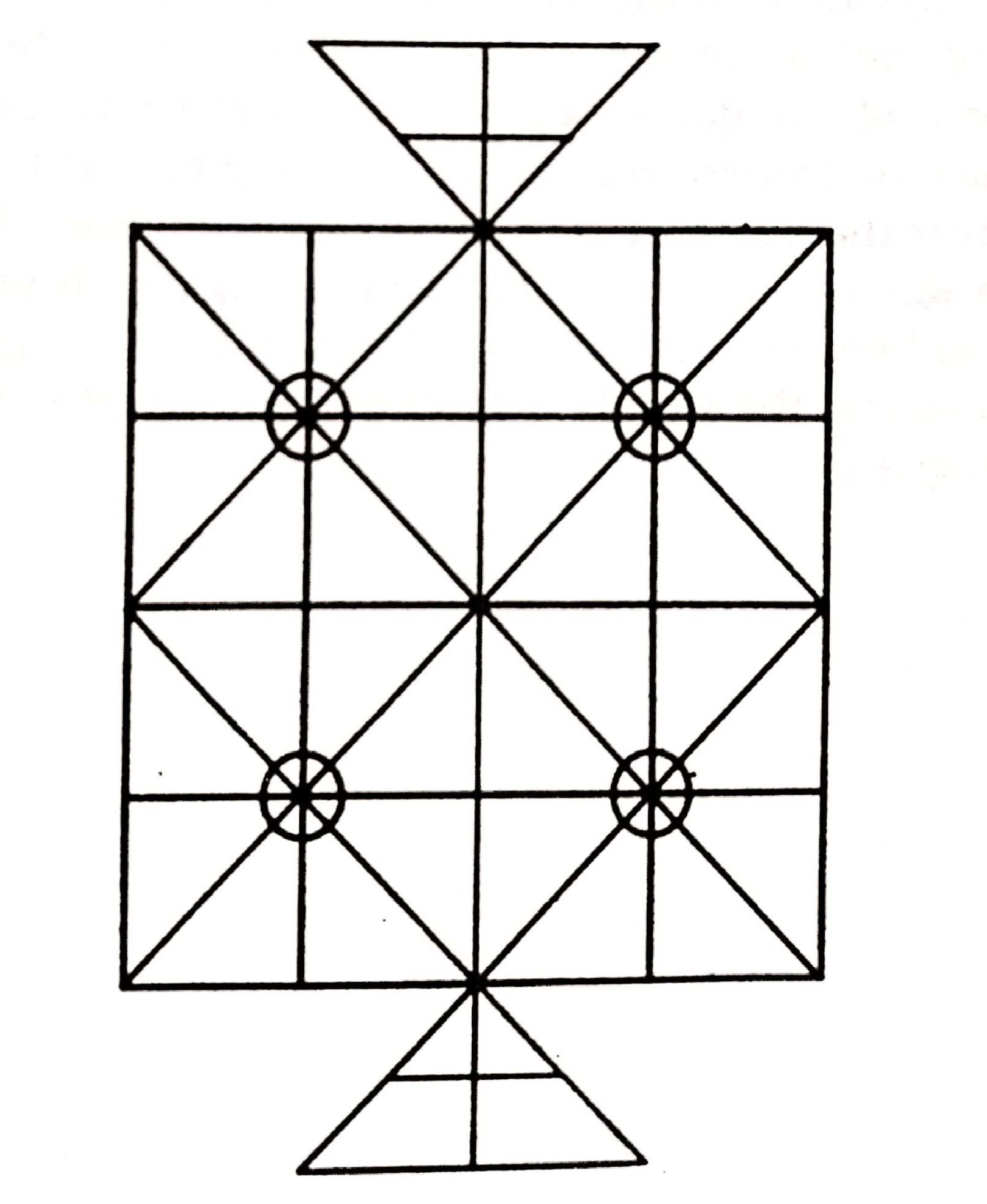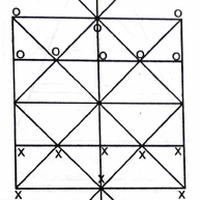 5x5 intersecting lines, with diagonals drawn in the four quadrants of the board. Two triangles, their apices intersecting the main board at opposite midpoints. The bast of the triangle is bisected by a line drawn from the apex, and this line is bisected and intersects with the other two sides of the triangle. One player plays as two tigers, which can be placed anywhere on the board, and the other player plays as 32 goats, which begin on the four central points of the quadrants of the square board, eight per stack. Players alternate turns moving a piece to an empty adjacent spot along the lines. The goats move one at a time from their stacks, and cannot be restacked once they have been moved. The tiger may capture a goat by hopping over it to an empty spot immediately on the opposite side of an adjacent goat. Multiple captures in one turn are allowed, but a tiger cannot hop over a stack of goats and hop over it again in the opposite direction. When tigers hop over a stack of goats, only one goat is captured. The goats win by blocking the tigers from being able to move; the tigers win by capturing all the goats.