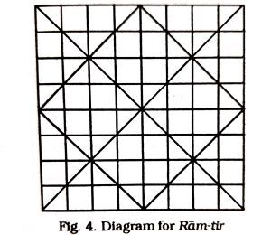 - This game has been documented by Charu Chandra Das Gupta. The information has been provided by an individual who was a staff of the Nalanda Museum at Bihar at the time. According to Charu Chandra Das Gupta, there are eighty one cross points out of which the central point remains vacant. This game has similarities according to Charu Chandra Das Gupta, with a game called Ratti- Chitti- Bakri or (red white goats). The only point of difference is that the boards used for the two are not similar to one another. The meaning of the word Ram-Tir could not be explained by the informant.