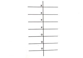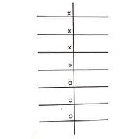 - It is played by six ballets or pieces, three belonging to each type. Hence, two types of ballets are required for playing it. At the beginning of the game three ballets of each type are placed in the cross points marked X and O and the central cross-point marked P is kept vacant. then one of the two ballets belonging to two different types and which are nearest to the central vacant cross-point marked P is shifted to this vacant cross-point. In the movement one ballet belonging to one type is shifted to a cross-point by jumping over a cross-point occupied by one ballet of another type or may occupy the next cross-point if it is vacant. Ballets of two different types are alternately shifted. The whole idea of playing this game is to shift the ballets originally placed in the cross-points marked X to the cross points marked O and also the ballets originally placed in the cross-points marked O to the cross-points marked X . In this way the player who can shift three ballets of one type originally placed in the cross-points marked X to the cross-points marked O and vice versa wins the game.