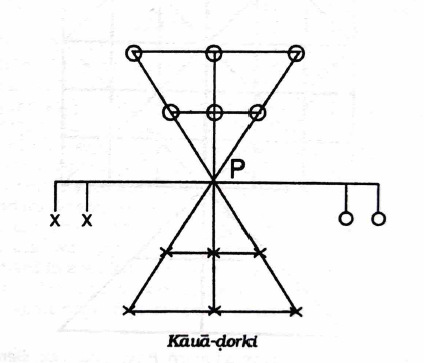 This game has been recorded by Charu Chandra Das Gupta in 1983 at Kosam village situated in the district of Allahabad. The informant of the game was Bacchu Singhala who was an inhabitant of the village. Das Gupta in his short essay further mentions about the similarities of Kaua Dorki and Egara-guti, or Lau-Kata-Kati or even Nao-Gutiya. The board as shown in the image has a common characteristic with the other games mentioned, which is that the two triangles meet each other at the apex. But one unique aspect of this game is that there is an additional horizontal line, intersecting the central point marked P, to which two vertical lines are drawn on each side and on where two pieces in possession of each player are placed at the beginning of the game.