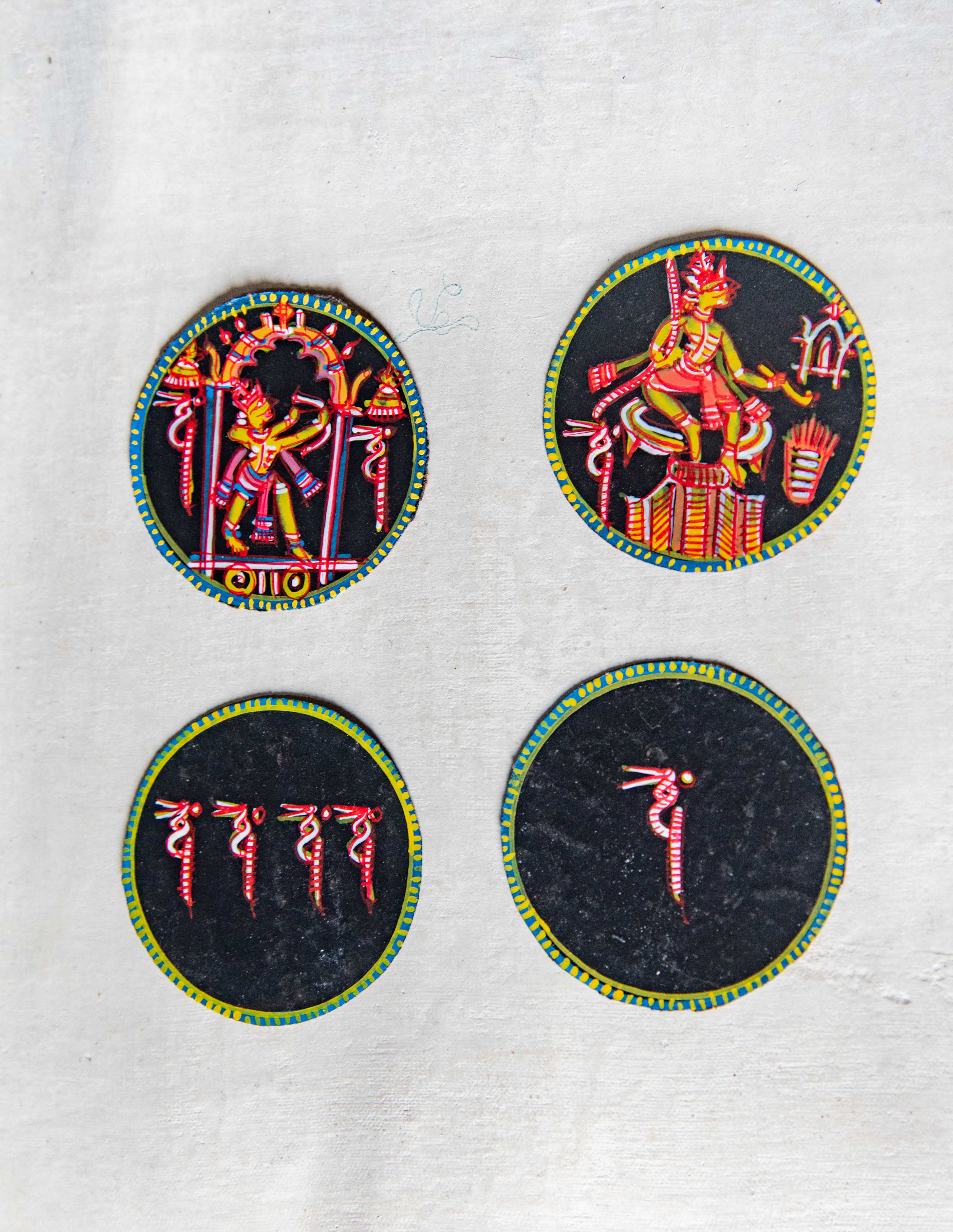 The images here showcase Ramayana Ganjifa or Ganjapa by Satyanarayan Maharana of Ghoraghatpura, one of the last remaining artists of Sonepur Ganjifa cards at Odisha. His family has been involved in making Ganjifa cards for generations and he has learnt the art from his father. His wife, Umavati Maharana is also an artist who makes Ganjifa cards. They are additionally artists who make patachitra paintings as well. Ganjifa cards are hand painted cards made out of cotton cloth, tamarind seed powder and khari mati (chalky soil). After the base of the cards are prepared, they are painted. While there are variants like Navagunjara, Ashtamala, Satyanarayan Maharana mainly makes Ramayana painted Ganjapa cards.