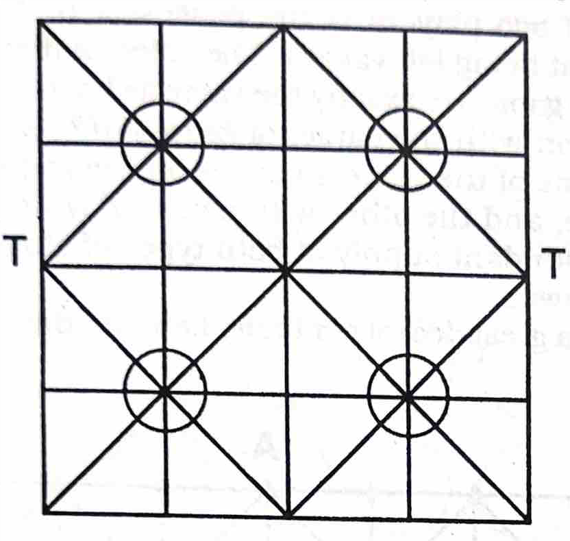 This game was documented by Hem Chandra Das Gupta while he was working on some of his own geological field work. The informants as he stated were Pathan or Pashtun who lived in Mianwali district of Punjab. He explained in his essay that the games he documented from the region were played by everyone in the area including both children and elders, and the games were found at times etched on stone slabs in common spaces. Similar looking boards have been commonly found both in incised patterns in various sites across India inside temples and also in other places.