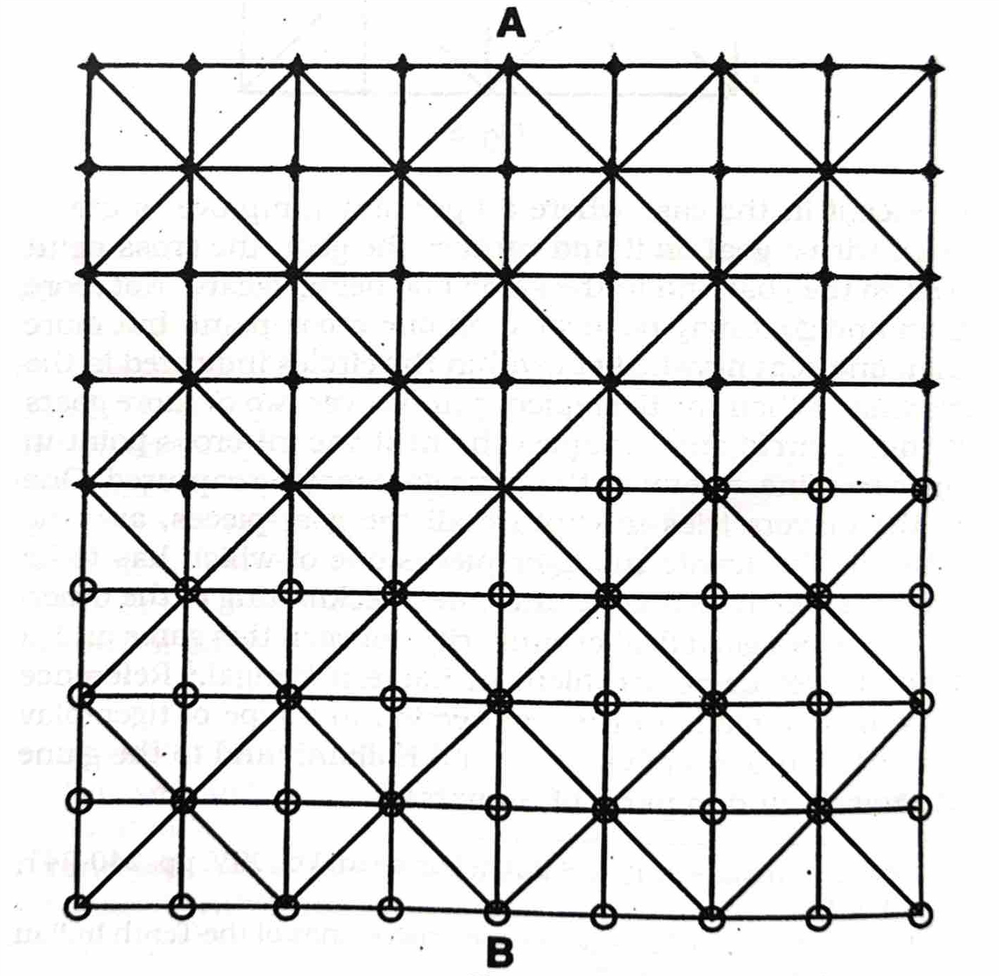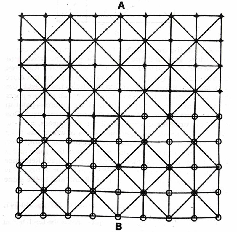 The board of this game has similarities with the games Bis Gutiya and Ram Tir from Bihar. It is a two-player game. According to Das Gupta, there are 81 cross-points and each of the two players is the possessor of 40 pieces, the central point being left vacant. The rules of this game are very similar to the game of Bara Guti. As explained by the informants, this game is played with red and white stones which also relates with the abundance of stones in the region of Mianwali, Punjab in Pakistan. There is a great deal of similarity between this game and the game known as Satul prevalent in Sumatra, the only distinction being that in the Sumatra game, two additional triangles with their apices at A and B are required. Each of these two triangles has six cross-points, so each player has to provide himself with 16 pieces instead of 40 as in case of the Punjab game.