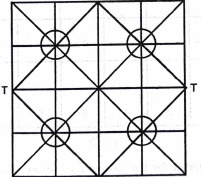 - 5x5 board, played on intersections, with diagonals for each quadrant of the board. One player plays with two tiger pieces, placed on the midpoints of two opposite sides. The other player plays with twenty goats, divided into four stacks of five, placed in the center of each quadrant. The goats move first. Goats may move one at a time to any adjacent vacant spot. More than one goat can be placed on the goats' starting spots, but not elsewhere. The tiger moves in the same manner, but also may capture a piece by hopping over it. Multiple captures can be made on the same turn with subsequent hops, but only the top goat in a stack is captured when a tiger leaps over it. The goal of the goats is to surround the tigers so they cannot move; when one tiger is blocked the other must be blocked on the next turn. The goal of the tigers is to capture all the goats.