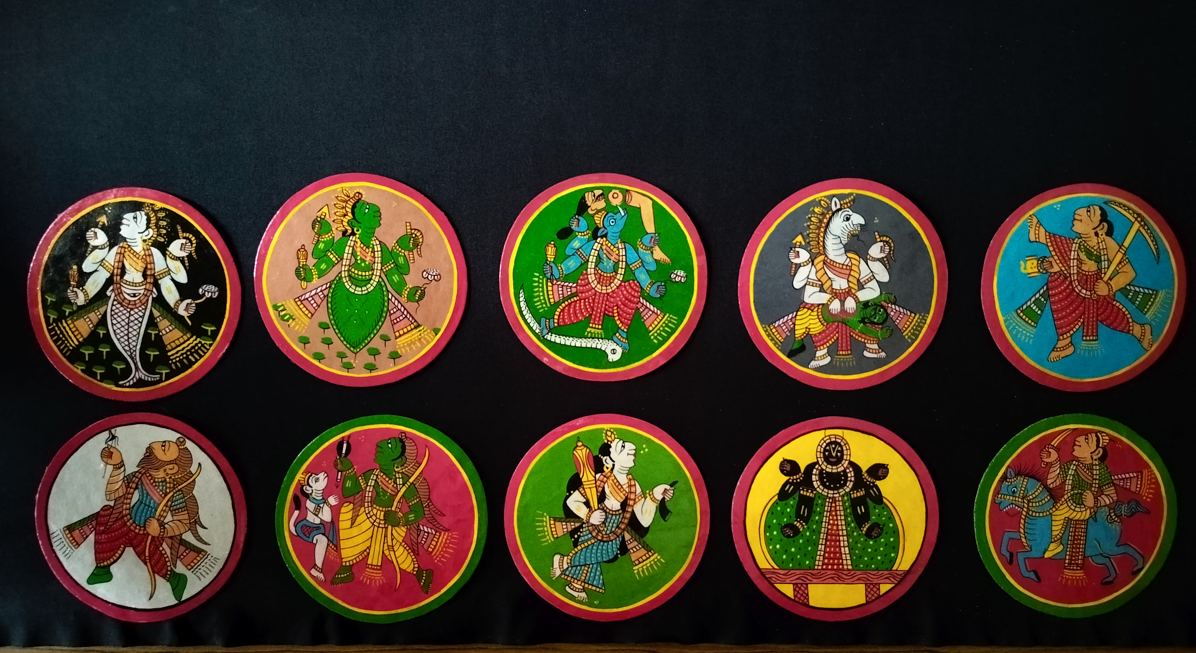 While the transition of Mughal Ganjifa to its regional variants is still unknown, the makers of the Dashavatar cards in Bishnupur trace back their lineage to the Rajputs in Rajasthan. The artist, Shital Fouzdar belongs to the eighty ninth generation of artists making these hand painted playing cards. The Fouzdar family has been associated with the Malla Rajas of Bishnupur and are popular for making these cards. The image here shows only the 10 raja cards of the avatars. These cards are 8inches in diameter which is larger than the usual 6inches diameter of other regional variants of dashavatar cards such as in Orissa and Maharashtra. Another interesting feature of these cards lies in the differences in their artistic styles, the materials they use, their iconography and even the avatars that they paint. For example in Bishnupur (West Bengal) and Raghurajpur (Orissa) the ninth avatar is Jagannath whereas in other places such as Sawantwadi (Maharashtra) it is Krishna or even Buddha in some cases.