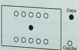 The name of this dexterity game for children is Gaya gaccha. The game piece 'ghuti' lying in the central place, or 'gaya,' must be struck by another ghuti to win the game as a whole. This signifies total loss to the opponent and marks the end of the game. A ghuti lying on its side is called gaccha, If a gaccha is hit, the said gaccha is won by that player, which indicates a partial loss to the opposition who must surrender that particular ghuti to the striker. These expressions are used verbally in the game.