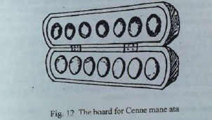 Cenne Mane Ata: There are seven pits on each players side. Players sit face to face with each other. This is a two player game. Each pit is filled with four seeds. The move of the first player begins by picking up all the seeds from one selected hole on their side and redistributing one seed each onto the next holes. After the last seed is placed and the players hands are empty they are required to pick again from the next hole and continue with the same move. This begins another lap and this goes on until the player reaches a hole that is completely empty. The opponent then takes their turn to move in a similar way. As the game proceeds, some of the holes will contain four seeds and some maybe less or more. Emphasis of capturing pieces is put on the hole with four seeds. The player captures the group of four during the course of the game and this move is called karu (four seeds). If the player misses to capture Karu and the seeds are placed as five then they miss their opportunity.