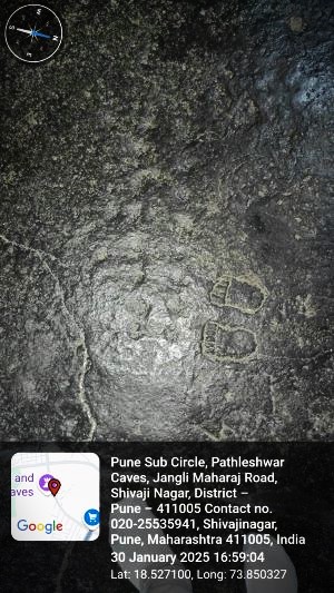 This is an etched or incised graffiti board of mancala documented from the cave complex of Pataleshwar. This particular board was found in the second row of the pillared halls of the temple. The board has two rows with eight holes or depressions. There is also an engraving of a small feet on the right side to it. Pataleshwar cave complex are a small group of five excavations, developed into a cave temple dedicated to Pataleshwar, God of the underworld or Shiva. This cave complex is ruggedly excavated and also bears resemblance with the Elephanta caves of Mumbai. The cave has unfinished murals on the sides and on the backside. There is a Nandi pavilion at the entrance of the cave which is circular. The inside of the main cave contains a pillared hall with a pradakshinapatha the way to go around the shrine. One side of the cave remains unfinished. This and other boardgames were documented on the floor of the cave.