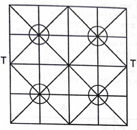 The board of this game has similarities with the games Bis Gutiya and Ram Tir from Bihar. It is a two-player game. According to Das Gupta, there are 81 cross-points and each of the two players is the possessor of 40 pieces, the central point being left vacant. The rules of this game are very similar to the game of Bara Guti. As explained by the informants, this game is played with red and white stones which also relates with the abundance of stones in the region of Mianwali, Punjab in Pakistan. There is a great deal of similarity between this game and the game known as Satul prevalent in Sumatra, the only distinction being that in the Sumatra game, two additional triangles with their apices at A and B are required. Each of these two triangles has six cross-points, so each player has to provide himself with 16 pieces instead of 40 as in case of the Punjab game.