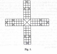 Chonpa- A Variant of Pachisi This variant of Pachisi has been recorded by by E. De. M. Humphries in Karwi, a district in Uttar Pradesh. It is known as Chonpa or Chaunsarh. According to Humphries, Another variant is known as “Chonpa” or “Chaunsarh.” It is a four player game, each having four “men,” coloured respectively black, yellow, green and red as shown in the image. The two former play in partnership against the two latter colours. The board is the same as a Pachisi board with the exception that the safe squares mentioned in the case of pachisi are either not marked at all or are disregarded, if the board is one made for both games. A single piece may, and a pair may not, be captured on any square to which a hostile piece may be moved. The moves are regulated by throwing three dice: not, as in the case of Pachisi, —cowries. These dice as documented were of bone or ivory and are about 2% inches long, marked on their long sides with the numbers (1), (2), (5) and (6).
