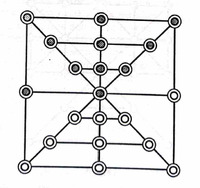 Kowwu Dunki - A Variant of Ahtarah Gutti ( Eighteen Pieces) This game along with another variant was recorded by E. De. M. Humphries in Karwi, a district in Uttar Pradesh. He mentions that these variants have the same rules as another game recorded by him and mentioned in the same essay, known as Ahtarah Gutti ( Eighteen Pieces). The only information we get on these variants is the changes in the shapes of their boards and the second board shown in the second image was played in Bargarh when he recorded these. These variants are important to understand how a board can change the strageties of a game. One major difference is that due to the changes on the board, Kowwu Dunki is played on a board of 21 spaces, instead of 37 spaces which changes the play pattern.